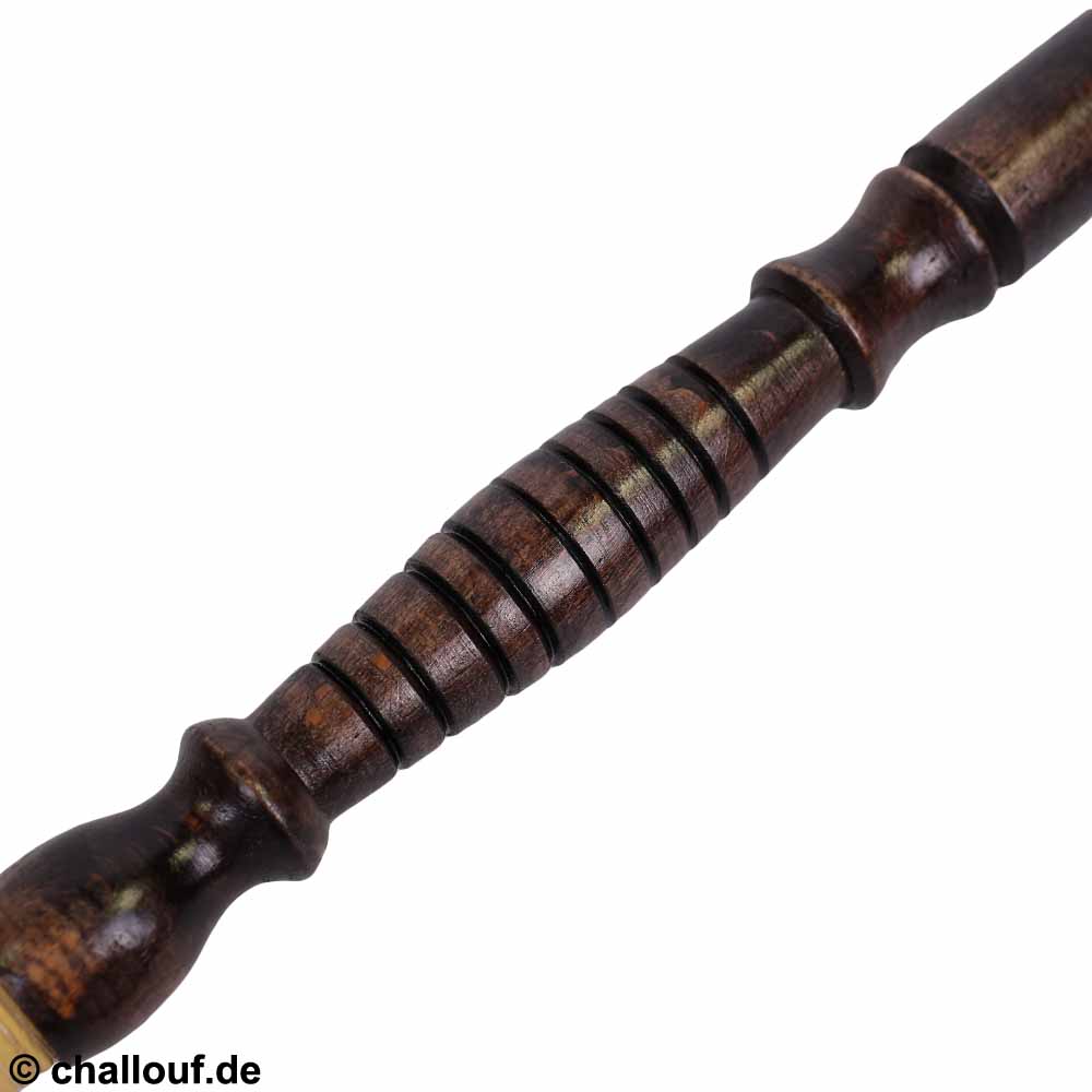 Das Mundstück des Schlauches ist aus Holz und im Inneren des Schlauches befindet sich eine Metallspirale.