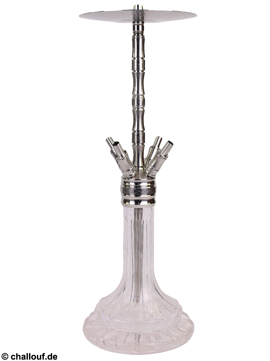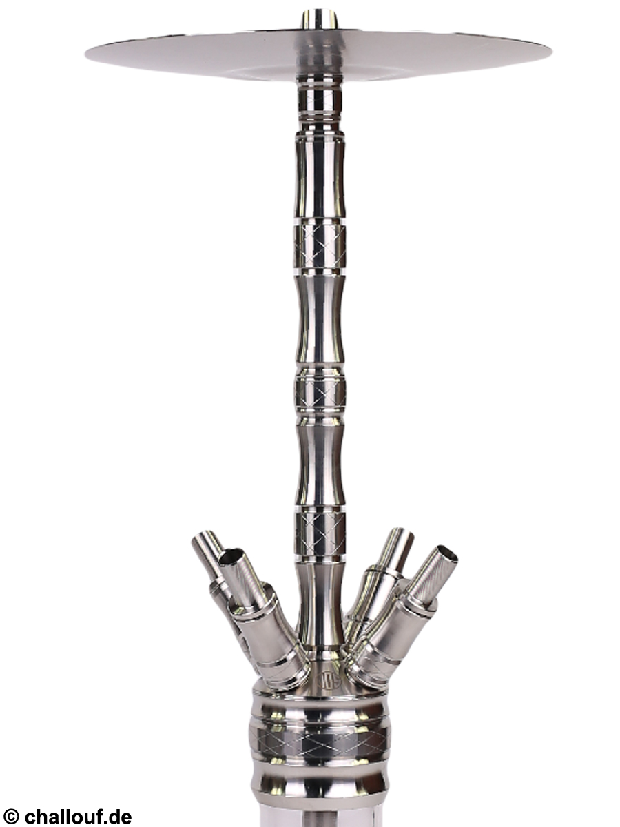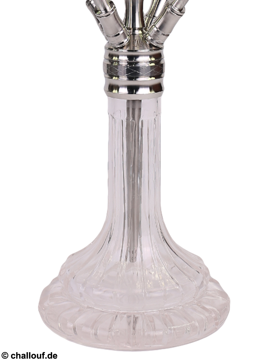 Alle Metallteile bestehen aus hochwertigem und rostfreiem Edelstahl und die Bowl ist aus Kristallglas gefertigt. Durch ihre breite Auflagefläche hat die Shisha einen guten Stand.