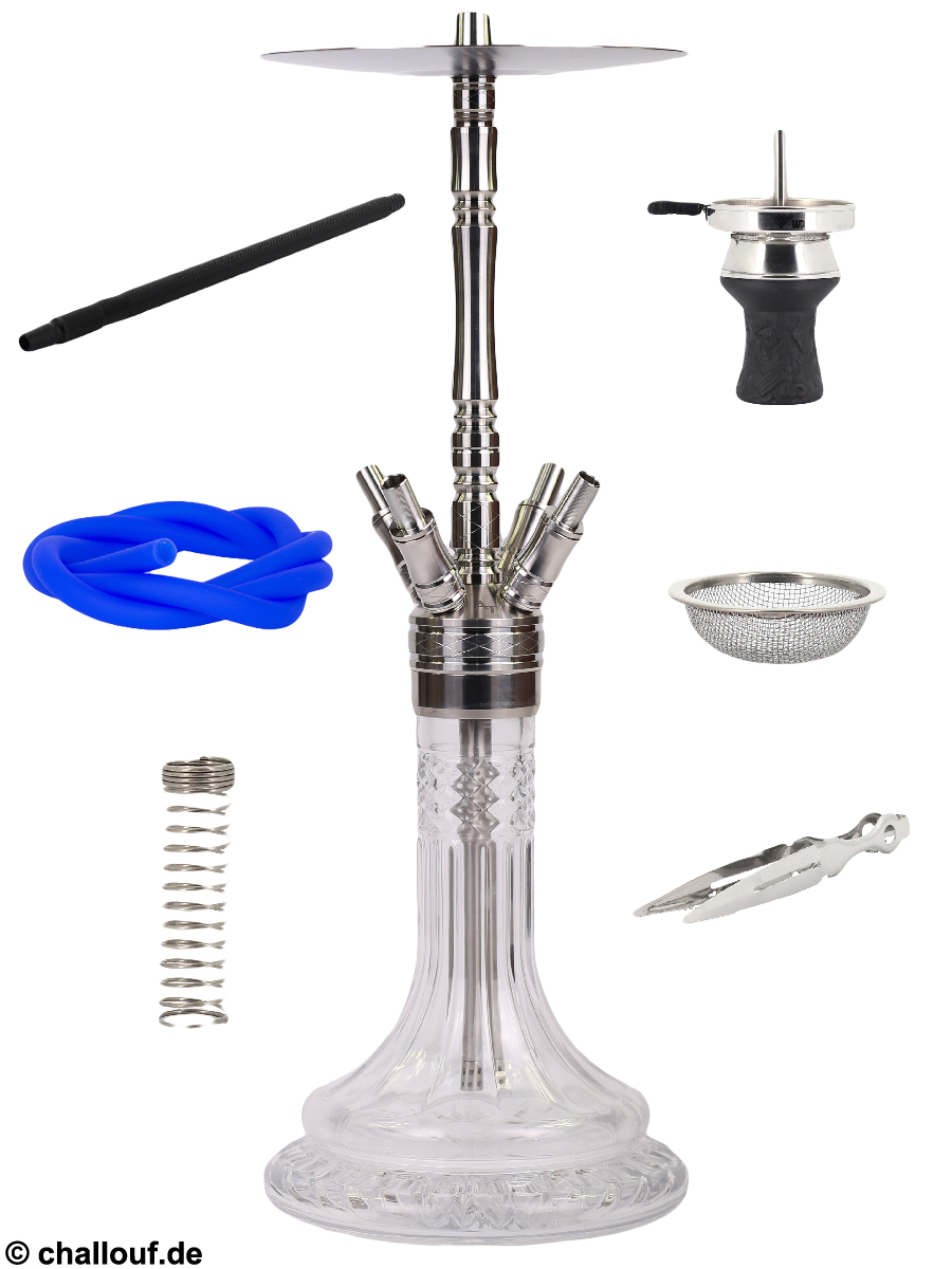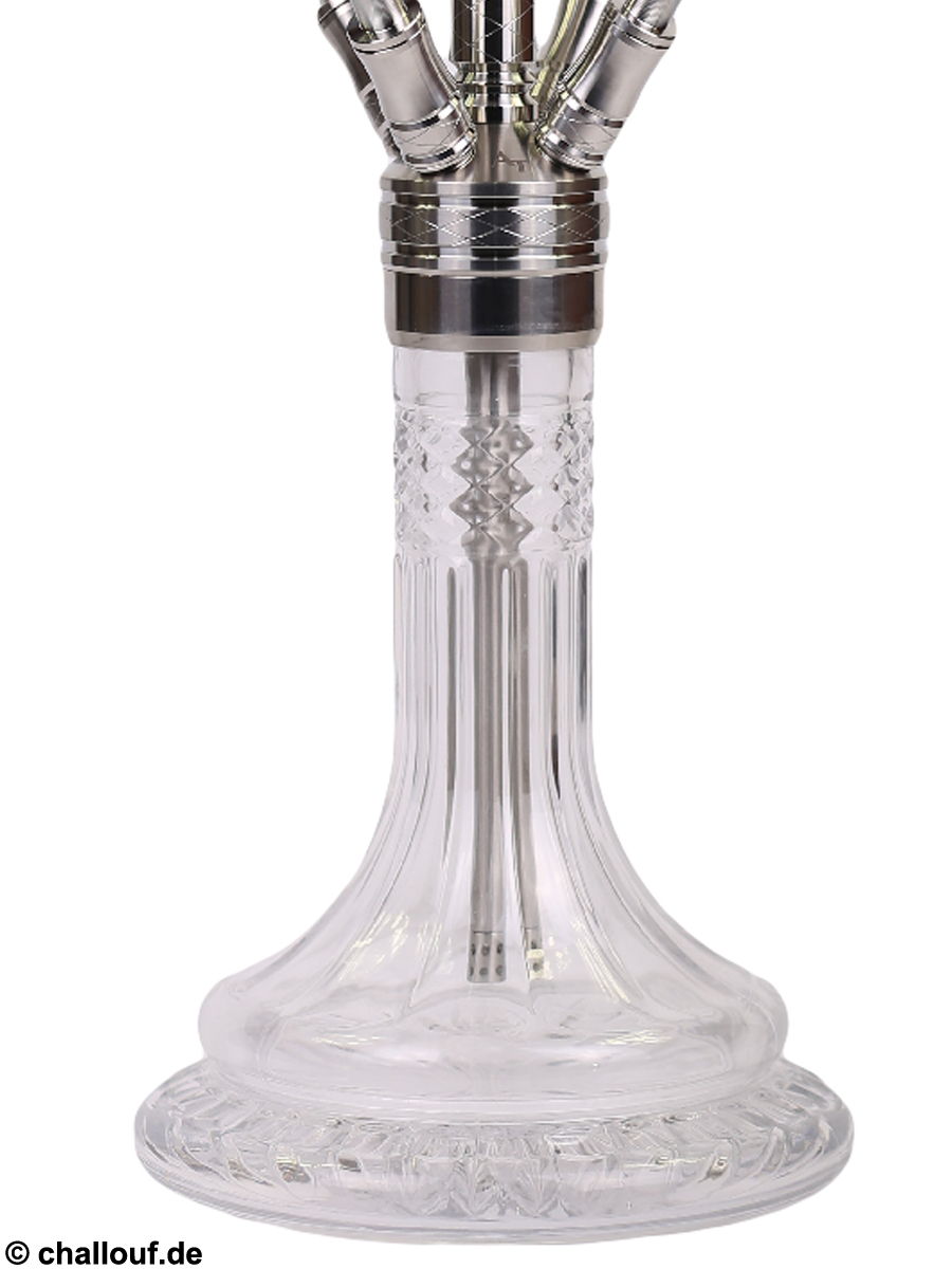 Alle Metallteile bestehen aus hochwertigem und rostfreiem Edelstahl und die Bowl ist aus Kristallglas gefertigt. Durch ihre breite Auflagefläche hat die Shisha einen guten Stand.