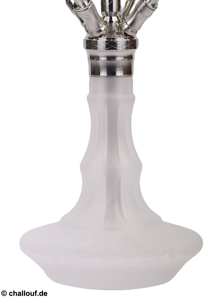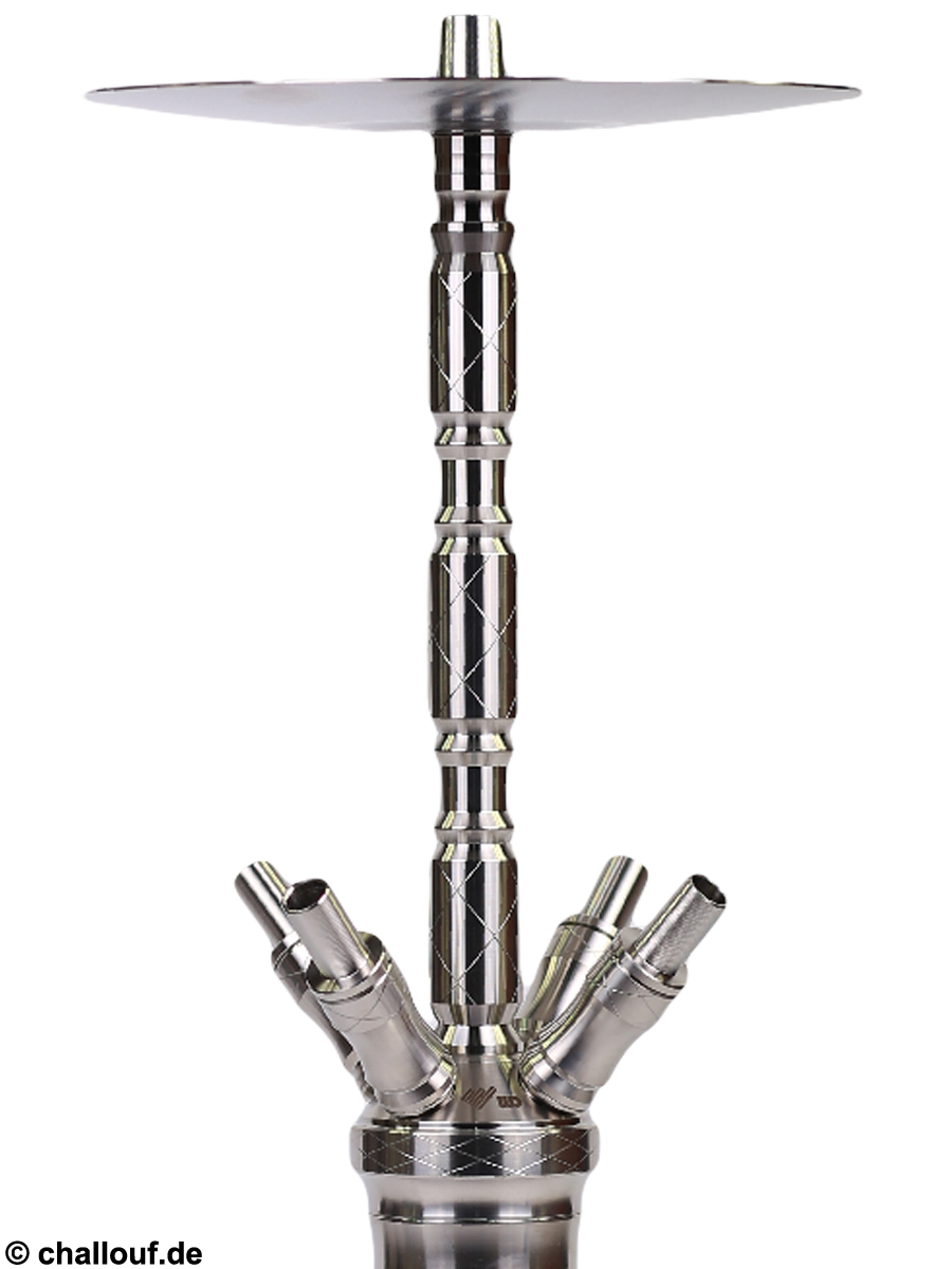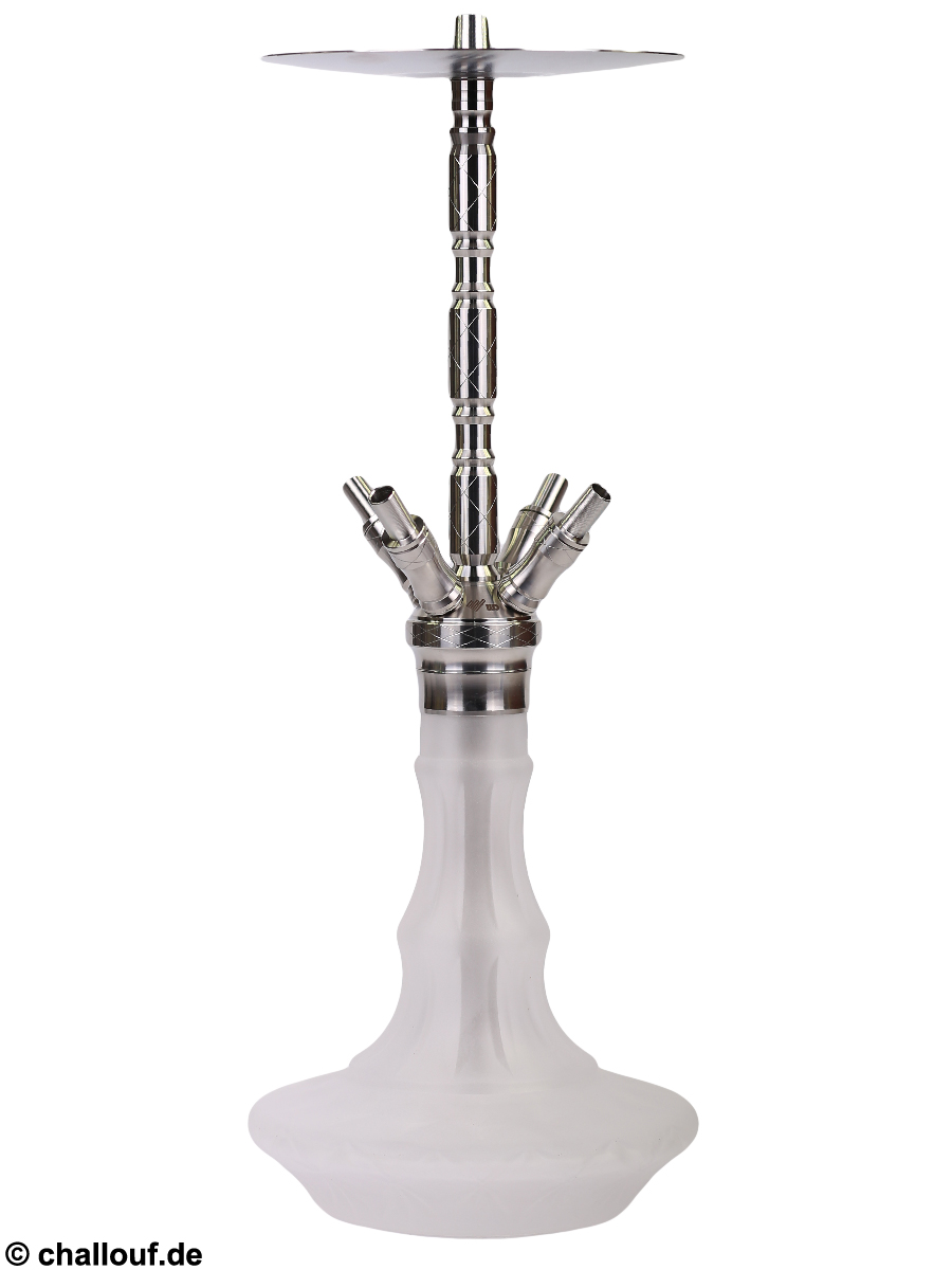 Alle Metallteile bestehen aus hochwertigem und rostfreiem Edelstahl und die Bowl ist aus Kristallglas gefertigt. Durch ihre breite Auflagefläche hat die Shisha einen guten Stand.